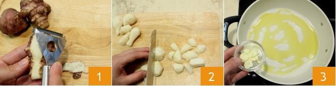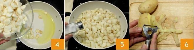 Para preparar el flan de topinambur puedes comenzar limpiando el tubérculo: elimina la piel externa con un pelador de patatas 1, luego enjuágalo bajo agua corriente y córtalo en cubitos 2; al final debes obtener aproximadamente 750 g de topinambur limpio. En una sartén grande, vierte un poco de aceite y un diente de ajo pelado y cortado en rodajas finas 3.