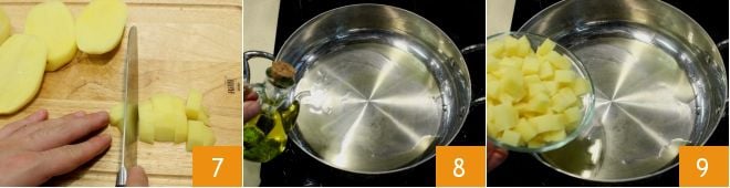 córtalas en cubitos pequeños 7 para acelerar la cocción; en una cacerola grande, vierte el aceite 8 y añade las patatas 9.