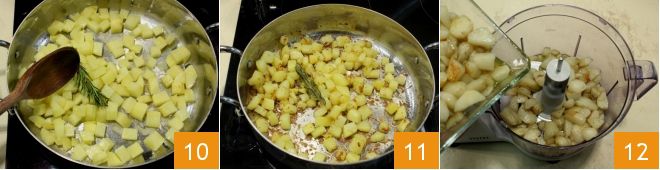 Añade una ramita de romero 10, sal y pimienta al gusto y deja cocer durante 10 minutos. Remueve de vez en cuando para dorar bien los cubitos de patata, cuando estén bien dorados apaga el fuego 11. En un procesador de alimentos vierte el topinambur cocido 12.