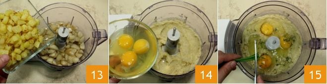 Añade también las patatas 13, luego tritura todo. Añade los huevos 14 y el cebollino picado 15.