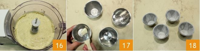 Haz funcionar el procesador hasta obtener una mezcla homogénea y cremosa 16. Luego prepara los moldes de aluminio con capacidad de 125 ml, úntalos con un poco de aceite 17 y luego cubre con papel de horno: corta un círculo para el fondo y tiras para el borde de manera que cubran completamente los moldes 18.