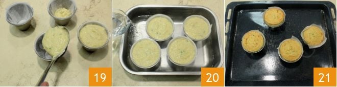 Luego con un cucharón vierte la mezcla de topinambur y patatas dentro de cada molde 19 dejando medio centímetro del borde. Coloca los moldes en una bandeja con bordes altos y vierte agua al ras de la base de los flanes 20. Cocina en horno estático precalentado a 180° durante 40-45 minutos. Después saca los flanes del horno, colócalos en una bandeja y pásalos al grill durante 5 minutos. Luego sácalos del horno 21.
