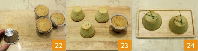 Saca los flanes de topinambur, déjalos templar, luego desmóldalos dándoles la vuelta sobre una tabla para cortar (22-23). Puedes servirlos decorándolos con una ramita de cebollino 24 y comerlos templados o incluso fríos como aperitivo o guarnición deliciosa!