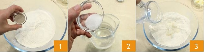 En un bol, mezclar la harina tamizada con la levadura seca 1, disolver la sal en el agua 2 y luego incorporarla a los polvos 3,