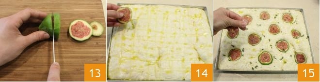 Mientras tanto, lava bien los higos y córtalos en rodajas de 1 cm de grosor sin pelarlos 13. Vuelve a coger la focaccia levada, unta la superficie con aceite de oliva y distribuye las rodajas de higo encima 14, presionando ligeramente para que se adhieran bien a la masa. Condimenta con el tomillo 15,