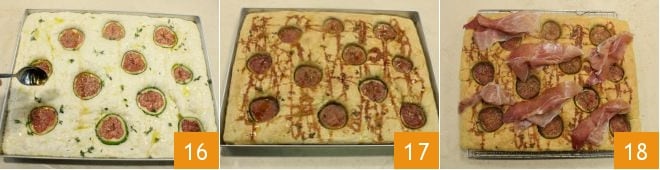 espolvorea la superficie con miel 16 y sal gruesa. Hornea en horno estático precalentado a 180° durante 35 minutos (o ventilado a 160° durante 25 minutos). Cuando la focaccia esté bien dorada, retírala del horno 17, déjala templar y luego condimenta con las lonchas de jamón y un poco más de miel y sirve tu focaccia con jamón y higos 18!