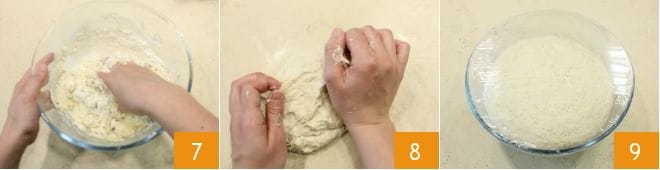 Amasar todo con las manos directamente en el bol 7, cuando hayáis recogido todos los ingredientes, trasladadlos a una superficie de trabajo ligeramente enharinada 8. Trabajad la masa hasta que esté suave y elástica, dadle una forma esférica y colócala en un bol, cubre con film transparente y deja que suba durante 2 horas en el horno apagado con la luz encendida o en un lugar cálido, protegido de corrientes de aire. Transcurrido el tiempo de fermentación, retira la masa que habrá duplicado su volumen 9,