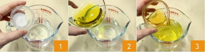 Para realizar la focaccia dulce con albaricoques, pon en una jarra el agua, añade la sal 1, la miel 2 y el aceite de oliva virgen extra 3.