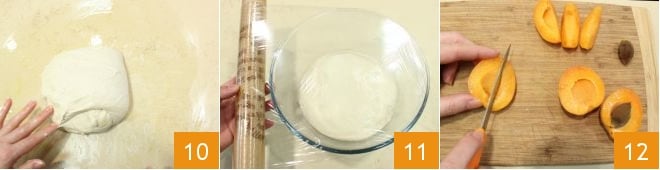 da una forma esférica a la masa 10 y luego colócala en un bol cubierto con film 11 y deja que repose durante unas 2 horas en el horno apagado con la luz encendida. Mientras tanto, lava la fruta, corta los albaricoques en rodajas de 1,5 cm eliminando el hueso 12