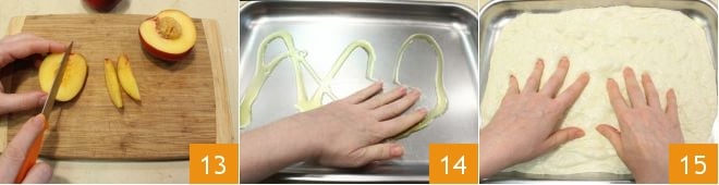haz lo mismo con los melocotones 13. Engrasa con aceite una bandeja de 40 x 30 cm 14, cuando la masa esté levada, extiéndela en la bandeja presionando ligeramente con las manos. Forma agujeros con las yemas de los dedos en la superficie de la masa 15