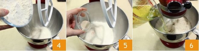 En el bol de una batidora con pala, tamiza la harina (puedes utilizar harina Manitoba o harina 0) 4 y añade la levadura de cerveza deshidratada 5. Pon en marcha la máquina y añade los líquidos 6
