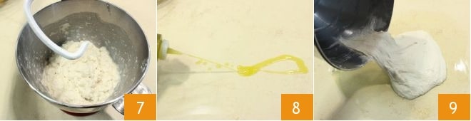 cuando los ingredientes estén mezclados, retira la pala y coloca el gancho 7, luego amasa durante unos 10-15 minutos. Saca la masa del bol de la batidora, tendrá una consistencia bastante suave, engrasa la superficie de trabajo 8, transfiere la masa a la mesa 9