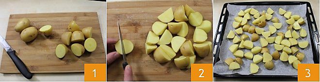 Para preparar la fondue de Reblochon, empiece cortando las patatas nuevas con piel en cuatro partes (1-2) obteniendo gajos. Cubra una bandeja con papel de horno, coloque los gajos de patata en la bandeja 3,