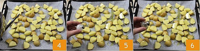 condimente las patatas con el aceite de oliva vertido en hilo 4, la sal 5, la pimienta negra 6