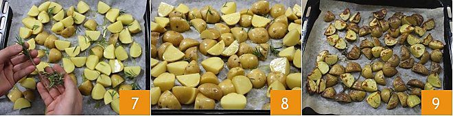 y finalmente aromatice los gajos con el romero fresco 7. Ahora las patatas así condimentadas 8 están listas para ser cocidas en el horno durante 15 minutos a 200° en horno precalentado en modo estático. Cocine las patatas hasta que estén doradas y hayan formado una ligera costra en la superficie 9.