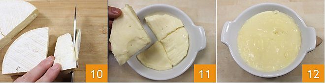 Prepare ahora la fondue de Reblochon: corte el queso en 4 rebanadas gruesas, retire la corteza externa de cada rebanada 10, coloque las rebanadas en una terrina redonda (de cerámica o de barro) que pueda contener la forma de Reblochon que mide aproximadamente 13-14 cm de diámetro y 3,5 de grosor 11. Hornee la terrina en horno precalentado a 200° durante unos 25/30 minutos, la fondue estará lista cuando el queso esté completamente fundido 12. Sirva la fondue de Reblochon caliente con las patatas al horno y, si lo desea, puede acompañar el plato también con una tabla de embutidos.