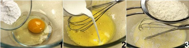 Batid el huevo y el azúcar glas 1 con una batidora, luego añadid la leche 2, una pizca de sal, la vainillina y la harina tamizada 3.