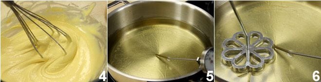 La consistencia de la masa debe ser cremosa y densa 4. Poned aproximadamente 3 dedos de aceite de semilla de cacahuete en una sartén baja y ancha y llevadlo a 180°5 (intentad mantener la temperatura del aceite bastante constante); sumergid dentro del aceite el molde para buñuelos 6 con la forma elegida atornillada al mango (suelen haber tres siluetas diferentes disponibles) y dejadlo calentar por unos segundos.