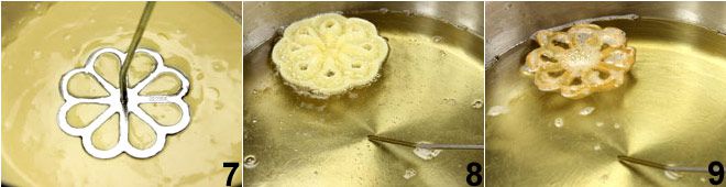 Extraed el molde, dejadlo escurrir y ponedlo un segundo sobre una hoja de papel de cocina. Sumergid el molde en la masa 7 sin que esta última supere los bordes superiores del molde. Inmediatamente sumergid el molde en el aceite de modo que la masa quede unos milímetros por debajo; esperad unos segundos y luego agitad ligeramente el molde para que la masa, al hincharse, se desprenda sola 8. Proceded así hasta formar y freír 3-4 buñuelos a la vez que dejaréis dorar por ambos lados 9.