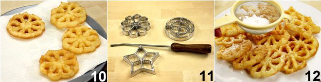 y luego ponedlos a escurrir sobre papel de cocina 10. Continuad del mismo modo hasta terminar toda la masa (formaréis unos 45-50 buñuelos), teniendo en cuenta que también podéis elegir cambiar la forma y realizar buñuelos de varias siluetas. 11 Cuando todos los buñuelos estén listos, espolvoreadlos con azúcar glas 12 vainillado y... ¡buen provecho!