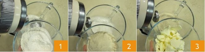Para hacer los candy cane twist cookies, vierte en el bol de una batidora equipada con pala, 230 g de harina 1, la harina de almendra 2 y la mantequilla fría en trozos 3.