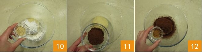 Coloca las dos masas en dos boles separados: en una añade los 20 g restantes de harina y el jengibre en polvo 10 y mezcla para integrar, en la segunda vierte el cacao 11 y la canela 12