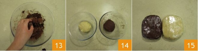 y trabaja como la anterior 13. Ahora que las masas están listas 14, aplánalas ligeramente, envuélvelas con film 15 y deja reposar en el frigorífico al menos una hora (o más).