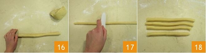 Pasado el tiempo de reposo, retoma los bloques, enharina ligeramente la superficie de trabajo y forma con ambas masas el mismo número de cilindros, de aproximadamente 0,5 cm de grosor 16. Corta con una espátula cada cilindro para obtener tiras de aproximadamente 15 cm de largo (17-18)
