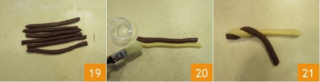 tanto blancas como negras 19. Coloca los cilindros uno al lado del otro en una bandeja y deja reposar nuevamente durante unos 10 minutos en el frigorífico, cubiertos con film sin aplastarlos. Deberán estar bien fríos antes de continuar trabajándolos. Pasado el tiempo necesario, retoma los cilindros, coloca una tira de cacao al lado de una blanca y con un pincel humedece ligeramente con agua uno de los dos 20; intenta entonces trenzar entre sí los dos cilindros 21