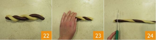y sin presionar, completa el cilindro trenzado 22; coloca uno a uno los cilindros bicolor en una bandeja y vuelve a ponerlos en el frigorífico por otros 10 minutos. Este paso también sirve para hacer los cilindros más manejables. Pasado el tiempo de reposo, retoma los cilindros bicolor y alarga los extremos del cilindro trabajando con las manos para integrar entre sí la masa blanca y la negra 23. El cilindro debe tener aproximadamente 1,5 cm de diámetro, corta los extremos con un cuchillo 24.