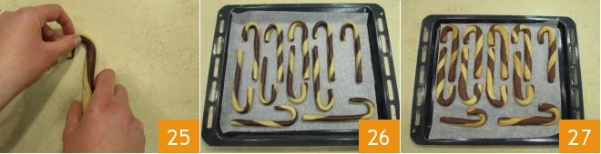 Dobla un lado formando los clásicos bastones navideños 25. Coloca en una bandeja con papel de horno 26 y hornea en horno estático precalentado a 170° durante 15 minutos en el nivel medio. Una vez completada la cocción, saca los candy cane twist cookies del horno 27 y deja enfriar completamente antes de servirlos, regalarlos o colgarlos en el árbol, quizás con una cinta roja!