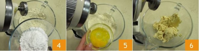 Enciende la máquina para obtener una masa arenosa, agrega entonces también el azúcar glas 4 y amasa durante aproximadamente 1 minuto. Añade el huevo ligeramente batido 5 y trabaja la masa hasta obtener una consistencia suave y lisa 6.