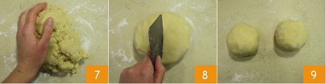Vierte la masa obtenida sobre la superficie de trabajo 7 y trabaja para obtener un bloque homogéneo. Divide el bloque en dos masas del mismo peso ayudándote con una espátula o un cuchillo (8-9).