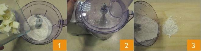 Para preparar las galletas de manzana, empieza con la preparación de la masa quebrada: en un procesador de alimentos, coloca la harina y añade la mantequilla fría de la nevera cortada en trozos 1. Acciona el procesador 2 y deja que trabaje hasta obtener una masa arenosa, que transferirás a una superficie de trabajo 3.