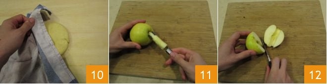 Cubre la masa con un paño seco y limpio 10 y déjala reposar. Mientras tanto, dedícate a las manzanas: quita el corazón con la ayuda del utensilio específico 11, luego corta las manzanas a la mitad 12.