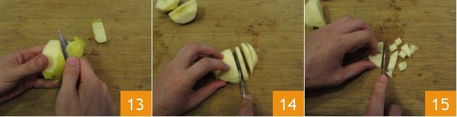 Elimina la piel 13, luego corta cada mitad de manzana primero en rodajas 14 y luego en dados de aproximadamente medio centímetro de tamaño 15.