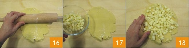 Extiende la masa con un rodillo 16 y añade los cubos de manzana 17, distribuyéndolos por toda la superficie de la masa 18.