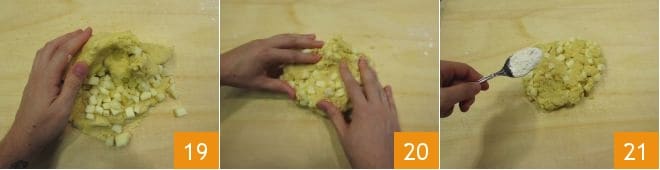 Amasa todo 19 tratando de mezclar bien los cubos de manzana en la masa 20. Al trabajarla, la masa se calentará y se volverá más húmeda, así que añade otros 50 g de harina para volver a compactar la masa mientras la trabajas. 21.