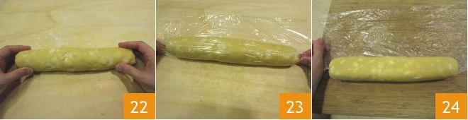 Da a tu masa la forma de un cilindro 22, luego envuélvelo en film transparente 23 y déjalo reposar en el frigorífico durante una hora. Pasado este tiempo, saca el cilindro de la nevera y desenvuélvelo del film, colocándolo sobre una tabla de cortar 24.