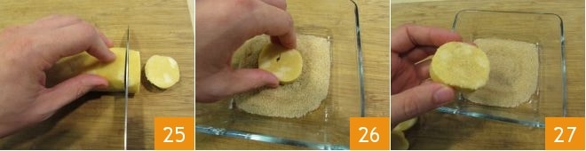 Con un cuchillo, corta discos de 1 cm de grosor 25. Con estas cantidades obtendrás unos veinte. Vierte en un bol el azúcar moreno y presiona suavemente un lado de cada galleta en el azúcar 26, de modo que los granos de azúcar se adhieran a la superficie 27.