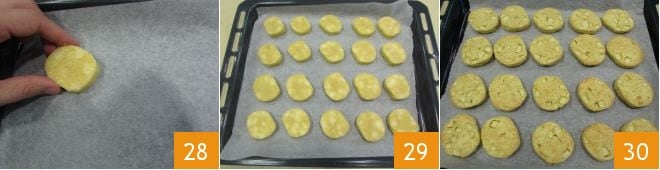Coloca las galletas en la bandeja del horno cubierta con papel de horno 28 bien espaciadas entre sí 29 y hornea en horno estático precalentado a 180° durante unos 20-25 minutos, hasta que la superficie de las galletas tome color y el azúcar haya formado una ligera costra. Cuando las galletas estén cocidas, sácalas del horno 30 y déjalas enfriar antes de servir: ¡tus galletas de manzana están listas para ser disfrutadas!