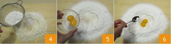 Forma la clásica fuente y tamiza el azúcar glas 4. Añade las 2 yemas de huevo 5 y una pizca de sal 6.