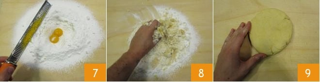 Añade también la ralladura de limón 7 y amasa rápidamente tratando de calentar los ingredientes lo menos posible 8 hasta obtener una masa compacta 9.