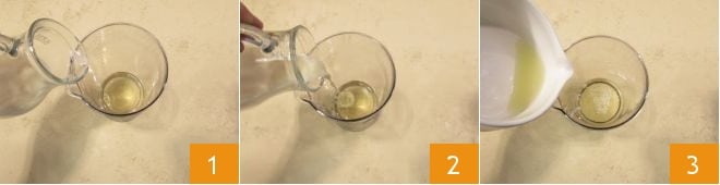 Para realizar las gambas al coco, comienza por la preparación de las salsas de acompañamiento. En el vaso de una batidora vierte el aceite de semillas 1, la leche de soja 2, y el zumo de lima exprimido y colado 3.