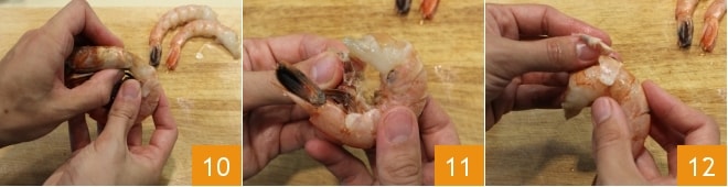 Dedícate entonces a la Cómo limpiar los gambones (en alternativa puedes utilizar langostinos): elimina las cabezas ejerciendo una ligera presión con las manos entre la cabeza y el cuerpo 10, después quítales las patitas 11 y extrae la carne del caparazón 12, sin desprender la cola.