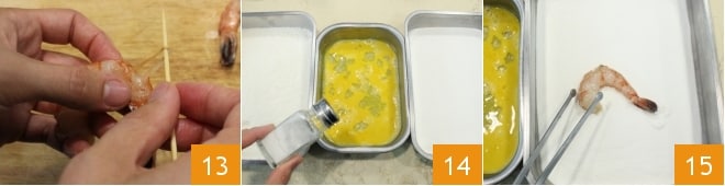 Elimina el intestino, que se encuentra en el dorso, ayudándote con un palillo o con la punta de un cuchillo 13. Luego prepárate con 3 bandejas que colocarás una al lado de la otra: en la primera vierte la harina de arroz, en la segunda rompe y bate los huevos y en la tercera coloca la harina de coco. Una vez batidos, sala al gusto los huevos 14 y pasa cada gamba por la harina de arroz 15.