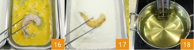 Después de haberlas enharinado, sumerge las gambas en el huevo batido 16 y finalmente pásalas por la harina de coco 17. En este punto, vierte el aceite de semillas en una cacerola de bordes altos y cocina hasta que el aceite esté bien caliente y haya alcanzado la temperatura de 170-180° (puedes comprobarlo con un termómetro de cocina) 18.