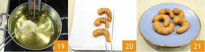 Sumerge las gambas en el aceite hirviendo y déjalas freír durante 1 minuto 19. Fríe siempre pocas a la vez, para que el aceite mantenga una temperatura correcta. Cuando estén bien doradas, retira las gambas con unas pinzas y déjalas escurrir en una bandeja cubierta con papel absorbente 20, después transfiera las gambas al coco a un plato de servir 21. ¡Tus gambas al coco están listas para ser servidas bien calientes, acompañadas de las salsas que has preparado!