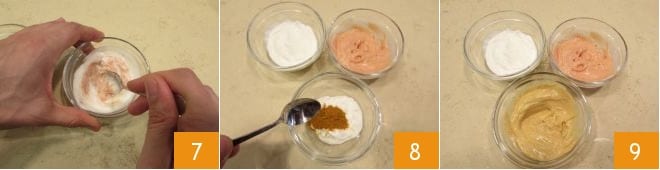 mezclando con una cucharita para amalgamar bien la mezcla 7. Pasa a preparar la segunda salsa, añadiendo en el último cuenco el curry tailandés rojo 8 y mezcla todo: tus 3 salsas están listas 9.