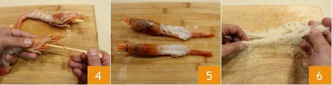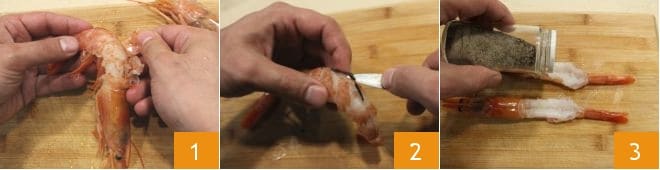 Para preparar las gambas en pasta kataifi con salsa de mermelada de albaricoque, empieza por limpiar las gambas: debes dejar la cabeza y la cola intactas, así que retira con cuidado el caparazón de las gambas 1, luego haz un corte en el lomo con un cuchillo y extrae el intestino 2. Sala y pimienta las gambas 3, espolvoréalas con hojitas de tomillo